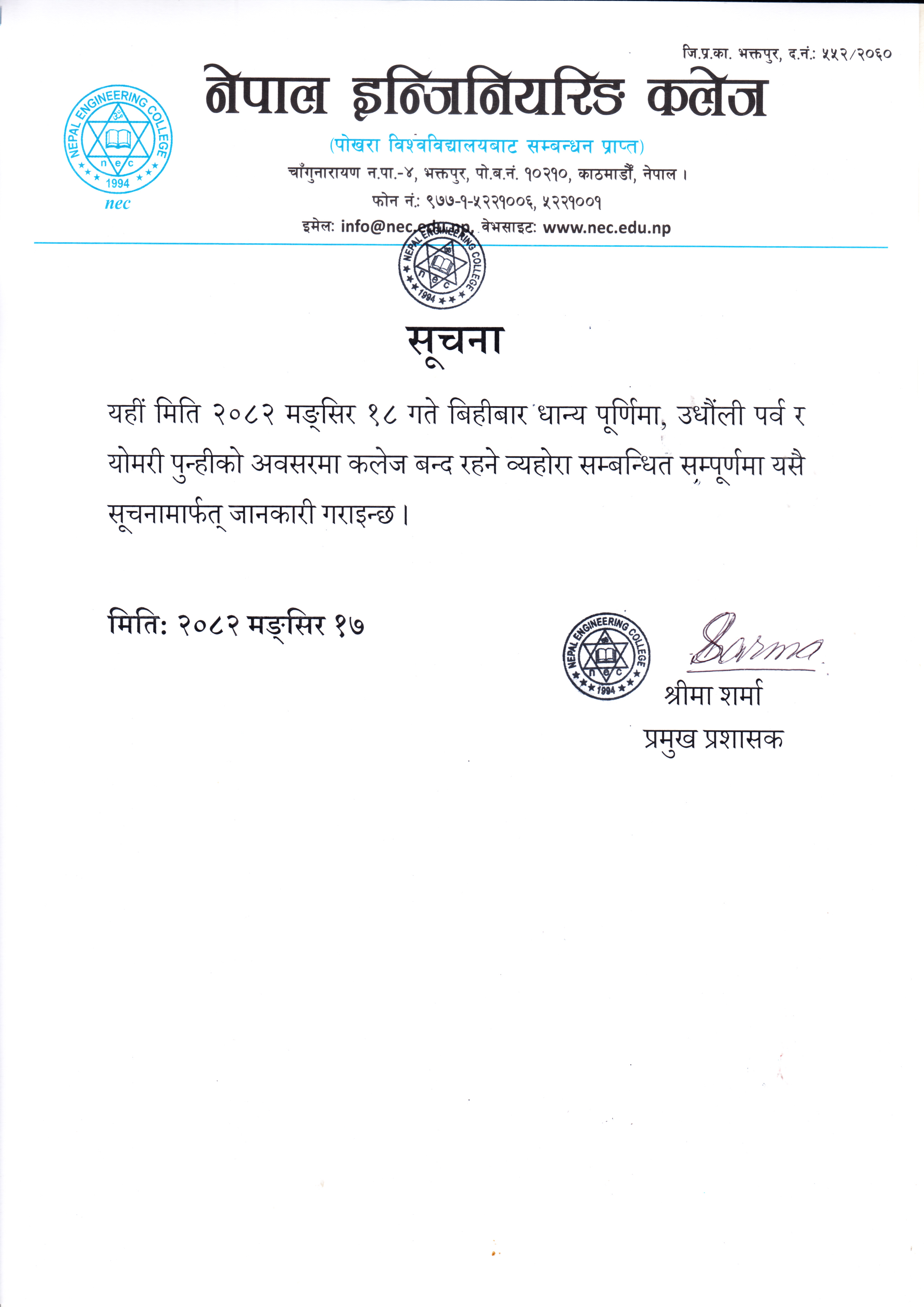 [NEPAL ENGINEERING COLLEGE STUDENT COUNCIL, (NESCo)] सम्बन्धि बिधान सुधार तथा संभावित निर्वाचन मिति तयको लागि सम्पर्क गर्ने सम्बन्धि सूचना ।